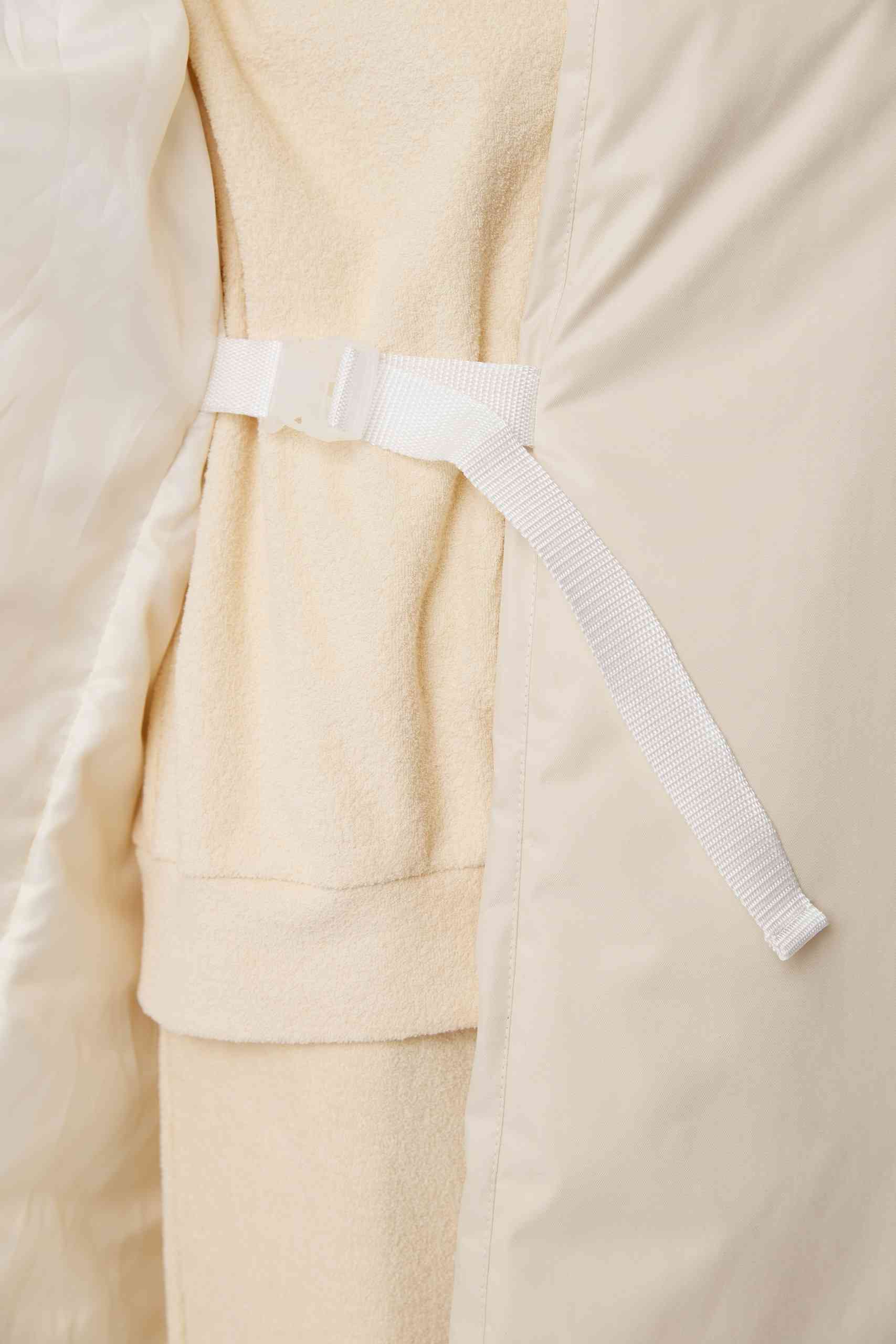 - застежка на регулируемую по длине стропу с внутренней стороны, а с внешней стороны – завязки из основной ткани
