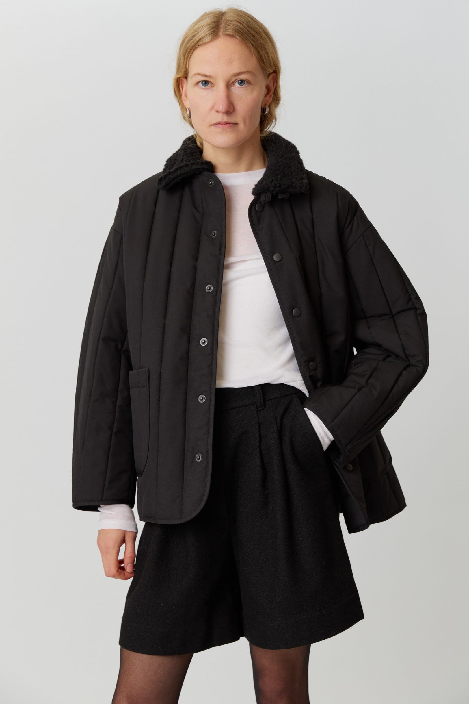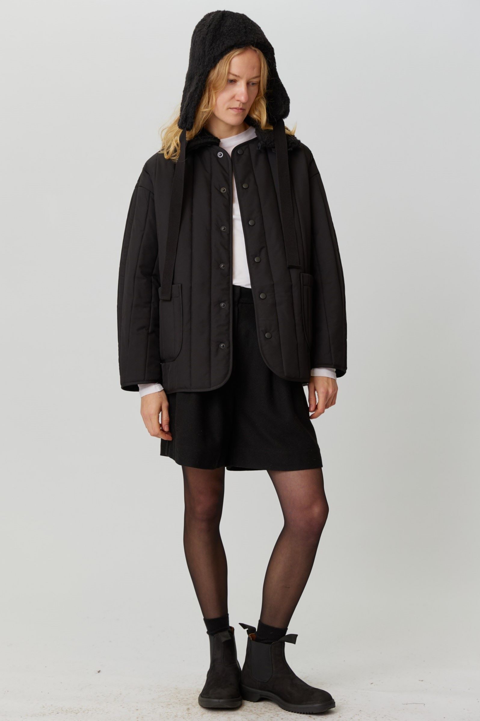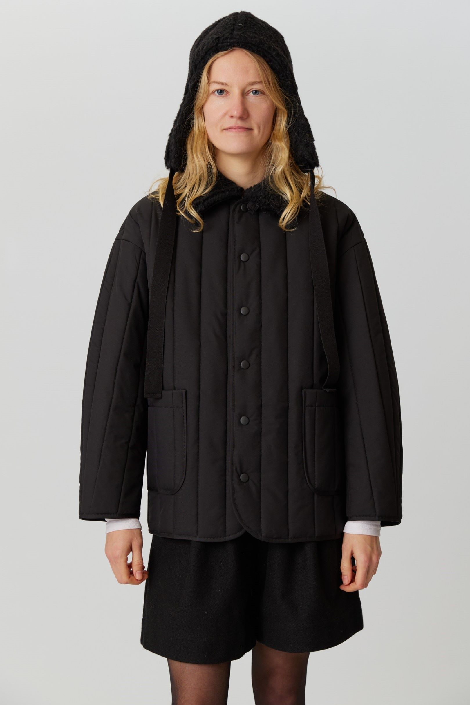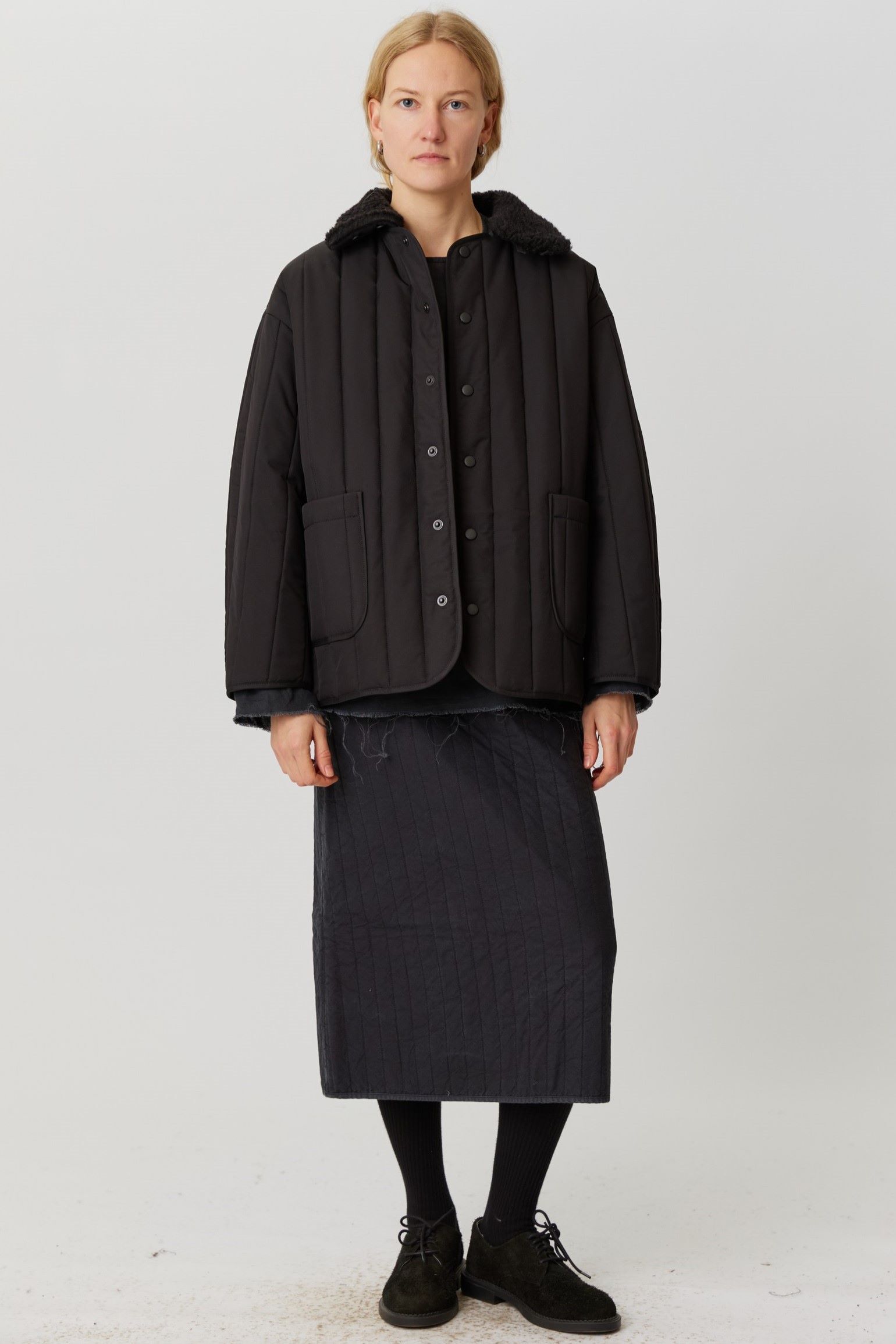 Рекомендуем выбирать свой привычный размер или на размер больше для более свободной посадки. Параметры модели: 86-68-90, рост 174. Размер куртки М(46)